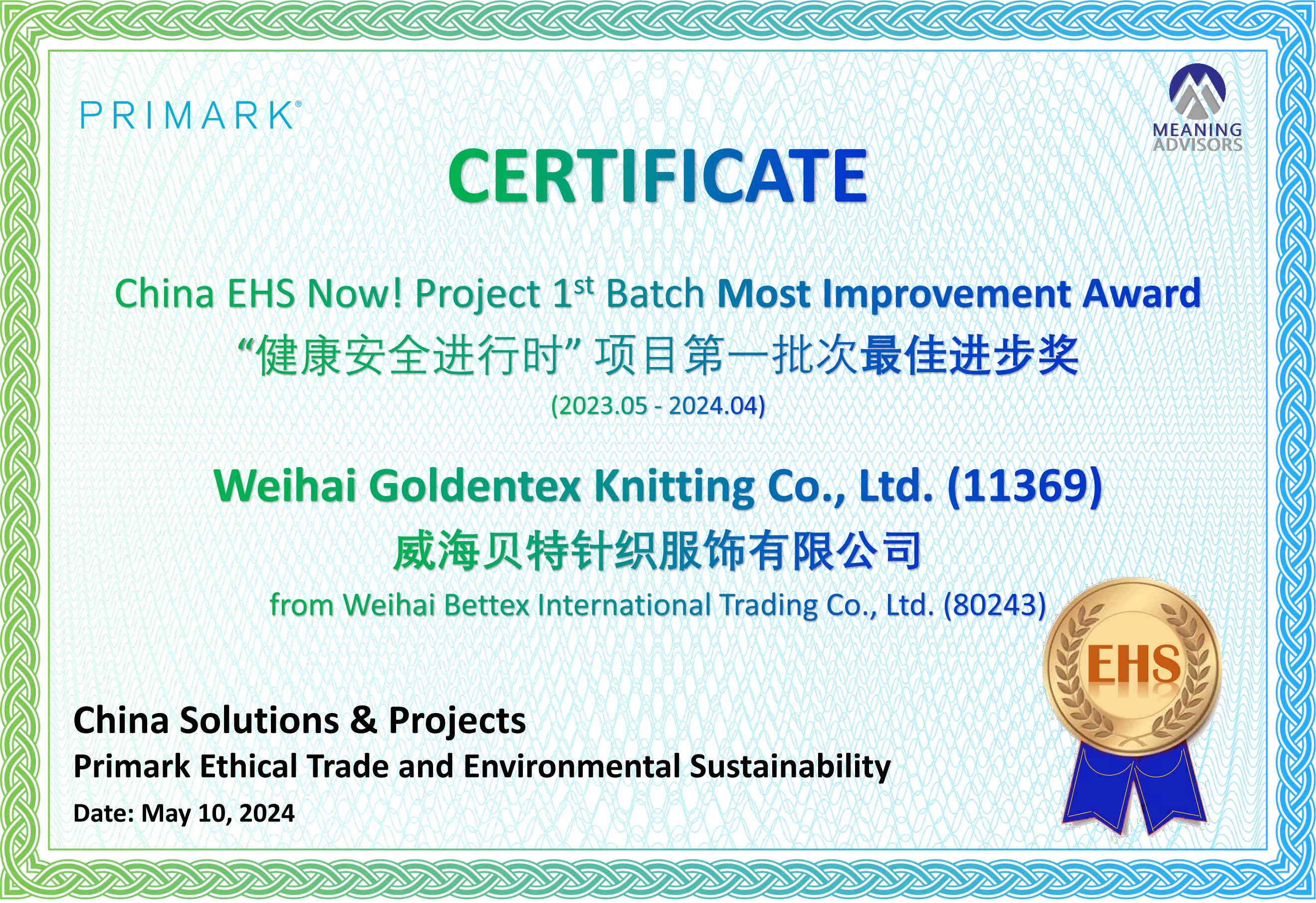 In May 2024, Weihai Beite Knitted Apparel Co., Ltd,one of the factories invested by BETTEX, has achieved outstanding performance in the "EHS" project organized by Primark,passing the assessment of the two systems of "ISO 14001 EMS" and "18001 OHSMS", it has been awarded the first batch of "EHS" Most Improvement Factory by Primark in China.
